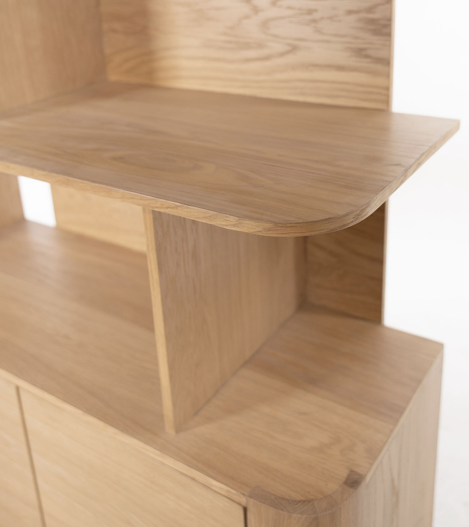 Theuns exploite une fois de plus son point fort : les meubles en chêne massif. Cette fois, la fraiseuse aura occupé une place prédominante dans le design.
