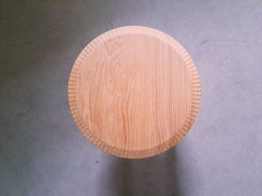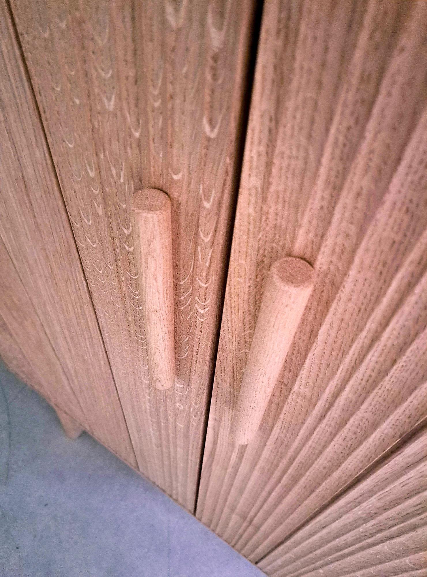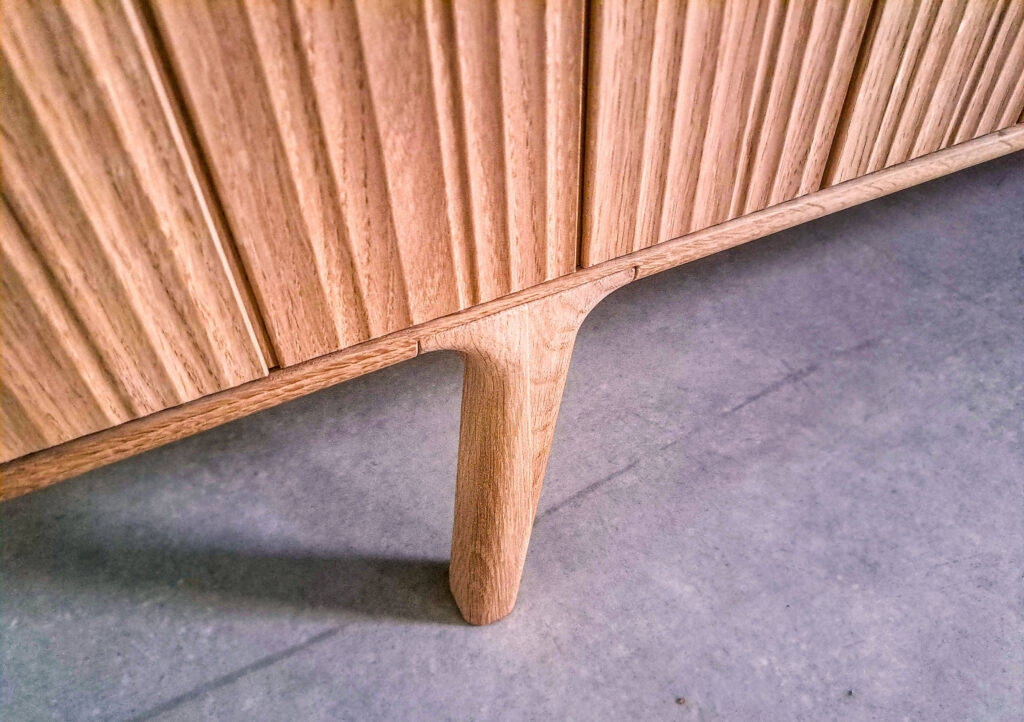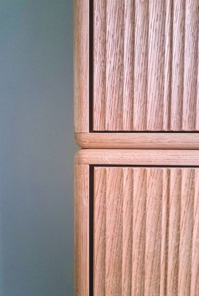 les meubles en chêne massif. Cette fois, la fraiseuse aura occupé une place prédominante dans le design. Impossible sinon d’obtenir un tel résultat. Un motif parfaitement rythmé de cannelures larges et étroites sur les façades, un discret pied parfaitement intégré à la plinthe.