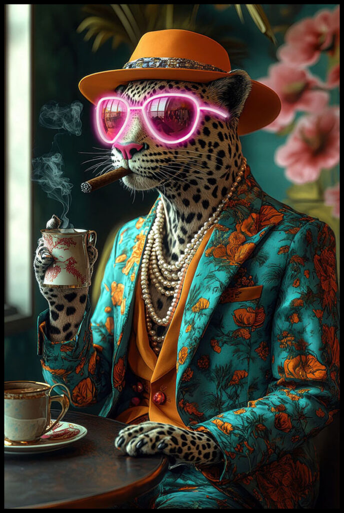 Dans un tout autre registre, on trouve la dernière tendance des tableaux en plexiglas. Comment les qualifier ? Surréalisme anthropomorphique ? Néo-pop-art ? Œuvre d’art glamour ? Art psychédélique ? Dans tous les cas, ces pièces ne passeront pas inaperçues : un animal sauvage vêtu d’une tenue excentrique, dans un cadre mondain et décadent. Collier de perles, épais cigare, cornes en guise de trophée sur le chapeau : hilarant ! Les lunettes LED fluo ajoutent un effet néon. Un interrupteur permet d’en régler l’intensité lumineuse.