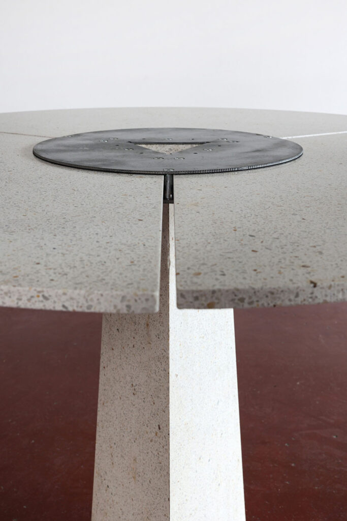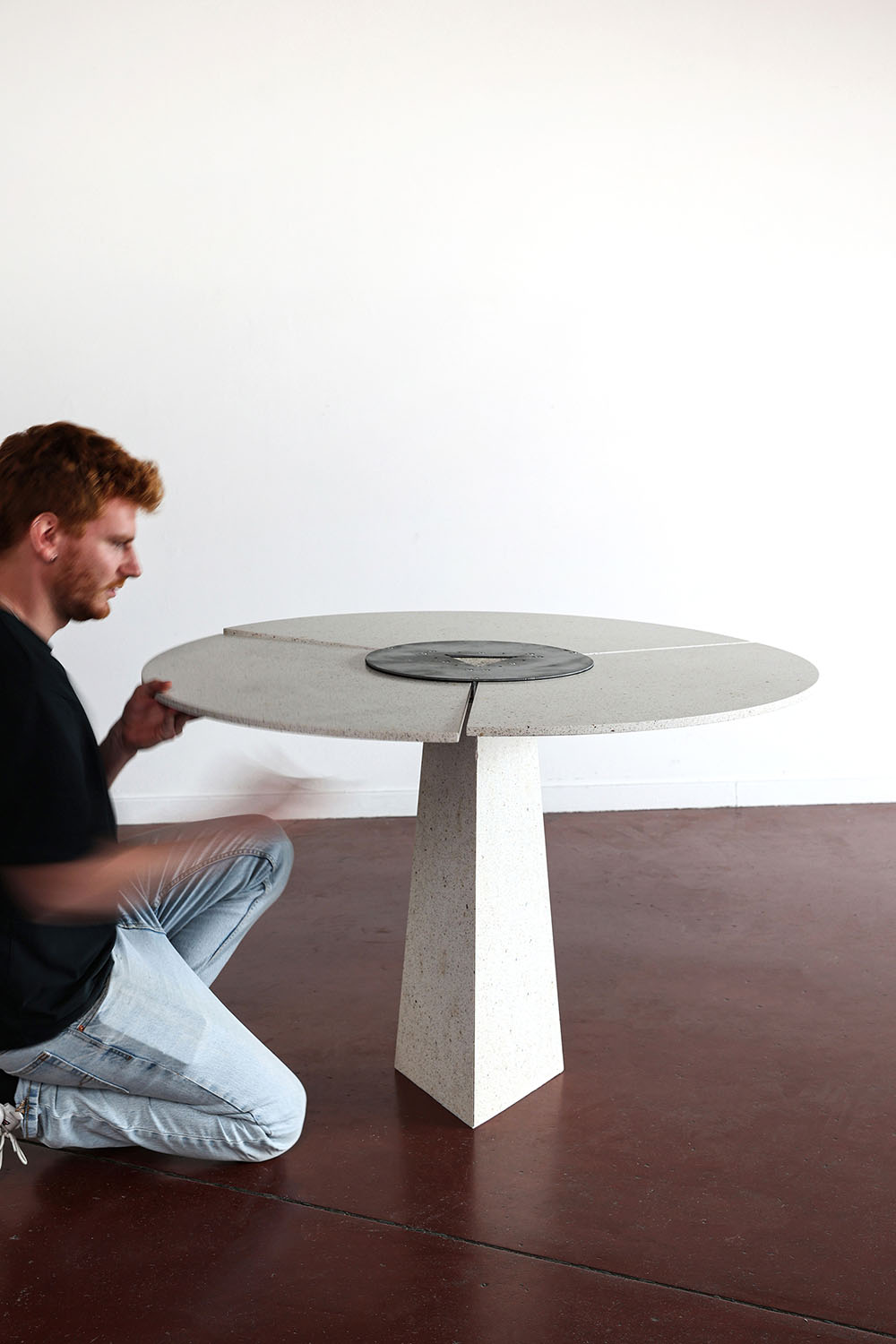 Impossible, clamaient les tailleurs de pierres. Lucas Desmet a prouvé le contraire. Le pied colonne adopte la forme d’un tétraèdre (une pyramide à base triangulaire). Les trois flancs en pierre coupés en onglet reposent l’un contre l’autre, sans aucun matériel de fixation. Seule la gravité est ici à l’œuvre. 100% naturel, comme à Stonehenge ou chez Serra. Le plateau est également composé de trois pièces, séparées d’une fente d’un centimètre. Une pièce centrale relie le tout. Pas besoin d’outils, les pièces se fixent simplement à la main. À l’image d’un tipi, la table Tripi se (dé)monte facilement — avec certes le concours d’une paire de mains supplémentaire. Car tout est question de précision, pour éviter que la table ne « trips », ne bascule. Le concept vise l’emballage démonté : les pièces sont conditionnées à plat dans une boîte de 100 x 50 x 20 cm. Les six plaques en pierre pèsent maximum 10 kg pièce, soit un poids raisonnable à soulever et manipuler. Vous savez à présent tout sur l’origine du nom.