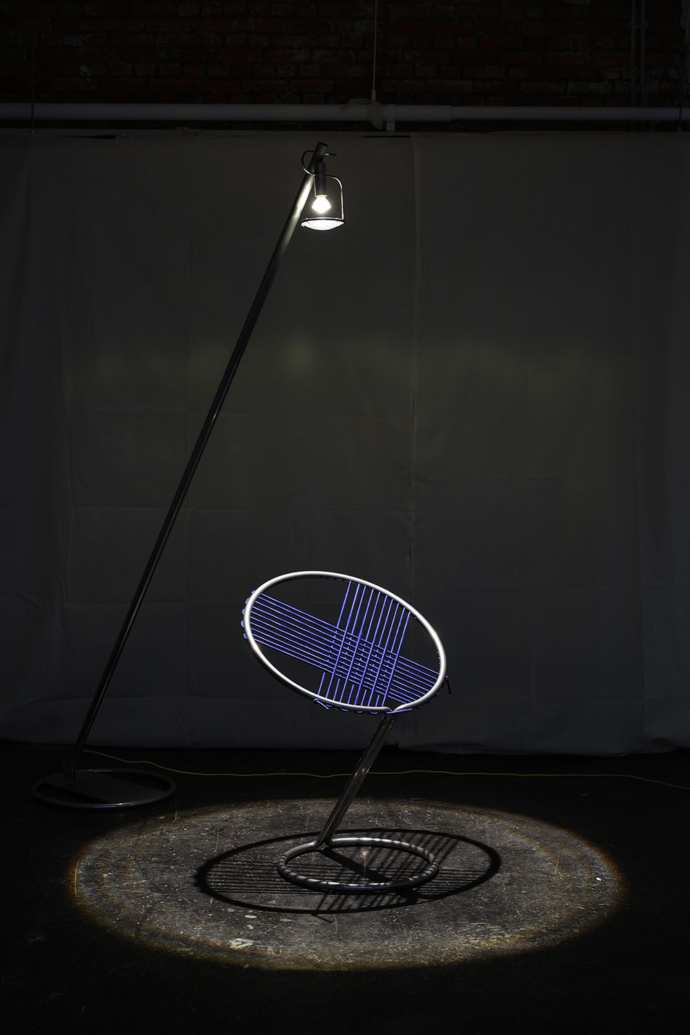 La lampe Container vient renforcer l’expérience. Positionnée près de la chaise Loop, elle dessine des cercles concentriques sur le sol : un cercle noir (l’ombre du cadre) à l’intérieur d’un disque de lumière. La lampe place la chaise au cœur d’un cône lumineux, tel un manteau enveloppant de lumière dans une pièce sombre, formant une sorte de mur immatériel. Il n’est pas là, mais on ne peut s’empêcher de le ressentir, comme une ligne de démarcation entre dedans et dehors. On se sent séparé, mais pas exclu. La lampe n’est donc pas un objet à part, mais intervient comme élément connecteur qui active chaque meuble de la série.