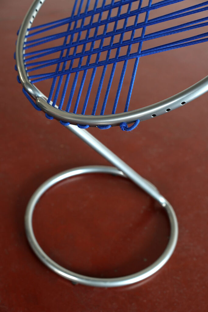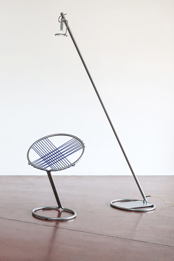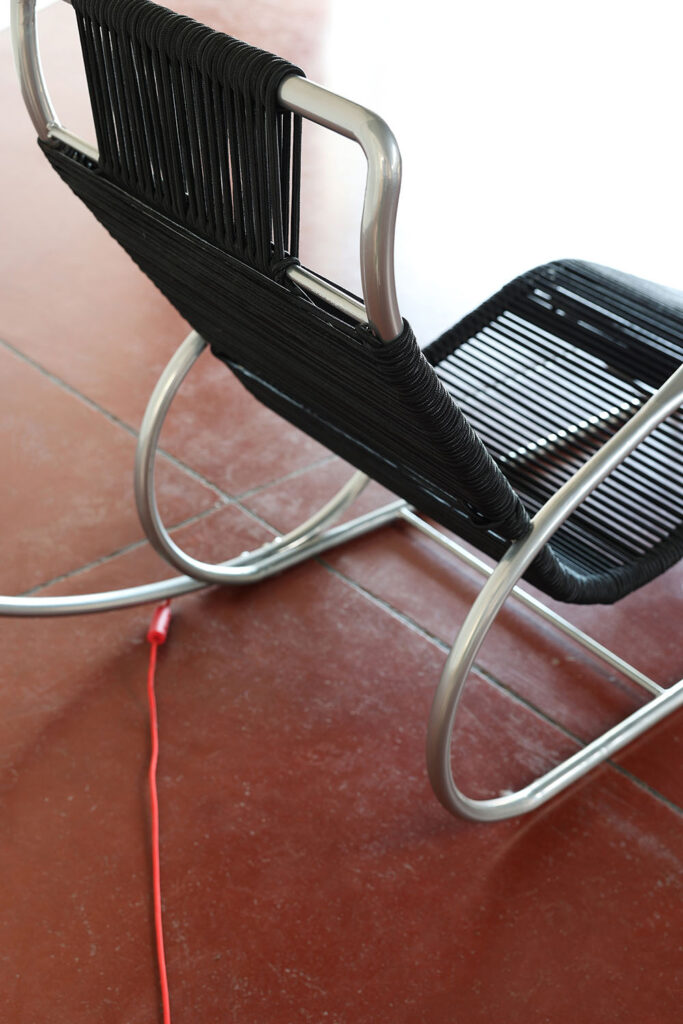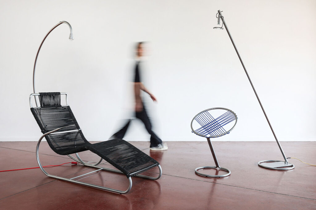 La chaise longue Loop trouve pour sa part comme point de départ l’étude menée par Charlotte Perriand pour sa LC4 concernant les positions couchées les plus ergonomiques et relaxantes. Conclusion : des bandes élastiques et un cadre tubulaire flottant ! Le corps se fond dans le cordage élastique, se sent embrassé, protégé, choyé. Bercé par ses propres mouvements, flottant, comme une allusion au lâcher prise, à la distanciation du monde qui nous entoure. Le voilà, ce moment feel-good.