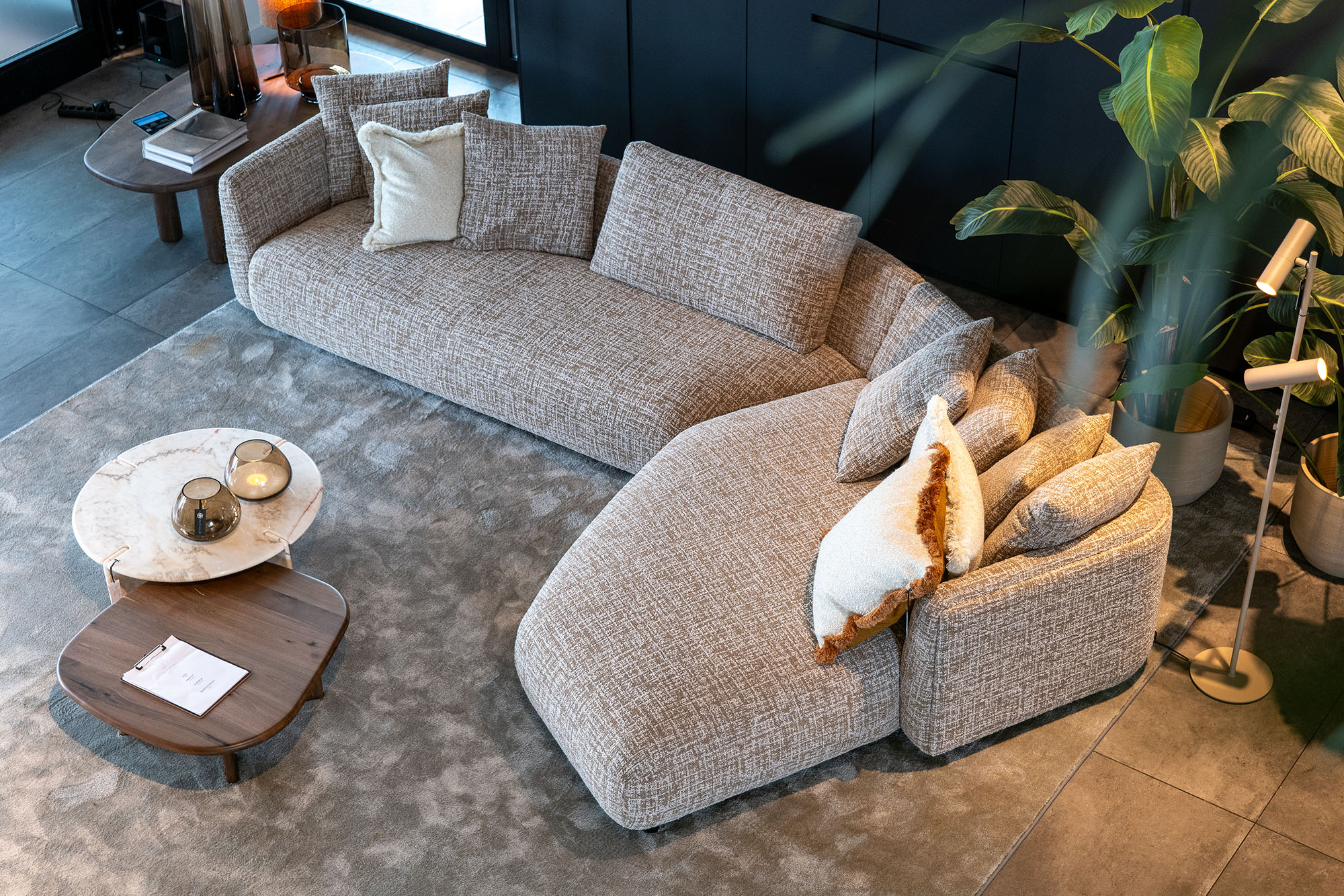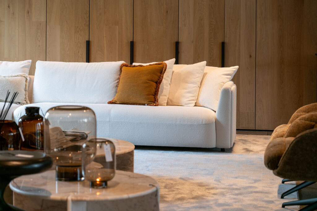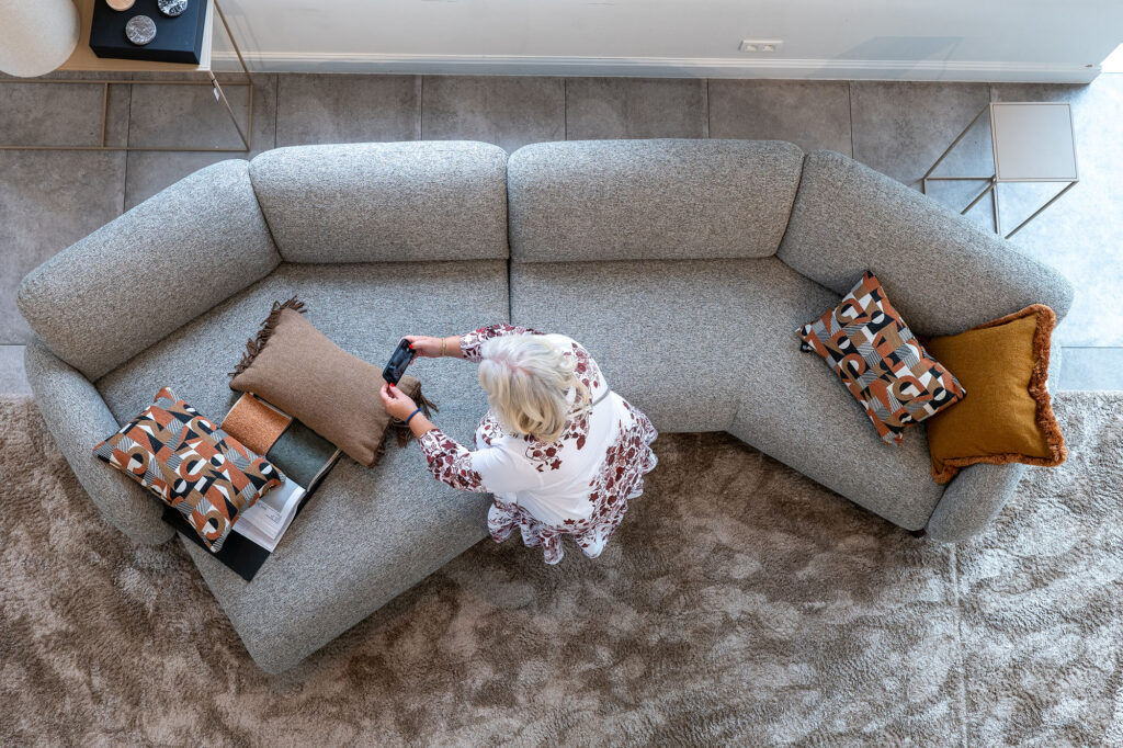Mais pourquoi alors ce titre « Ne pas s’asseoir » ? PassePartout fabrique quand même (notamment) des sièges ? Certes, mais un canapé n’est pas destiné à s’asseoir. Pour citer l’orateur néerlandais Jos Burgers : « Un magasin d’outils ne vend pas des foreuses, mais vend des trous ». Hum, voilà qui donne matière à penser… et c’est exactement ce que recherche le client ! Transposez cette phrase à notre branche et vous comprendrez qu’un canapé n’est pas fait pour s’asseoir, mais pour profiter de sa famille et de ses amis, pour se relaxer, regarder Netflix, réconforter, chérir des moments précieux. Un canapé, c’est tellement plus qu’un endroit où s’asseoir, c’est un lieu où expérimenter la vie. Et il en va de même pour les autres meubles. « La question-clé est : que veut le client ? Aussitôt que vous l’avez identifié, vous pouvez aller beaucoup plus loin ! C’est pourquoi nous investissons tellement dans l’atmosphère du stand, dans une édition de luxe de notre livre Stories (avec une couverture en lin !) et – ultra important – dans des outils de configuration en 3D. Tous les aspects de la vie du consommateur sont numérisés : en tant que professionnels, nous nous devons donc de suivre à tout prix ! » OK, cette modernisation, on pouvait s’y attendre.