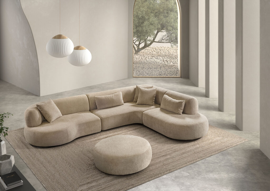 Commençons par les canapés. Anouk est véritablement un modèle de son époque : les formes organiques, le dossier bas, les nombreux éléments. Ce qui le rend particulier, c’est son élément de coin en forme de L arrondi. Ce qui le rend surprenant, c’est son confort d’assise à base de ressorts ensachés — caractéristique de Confortluxe.