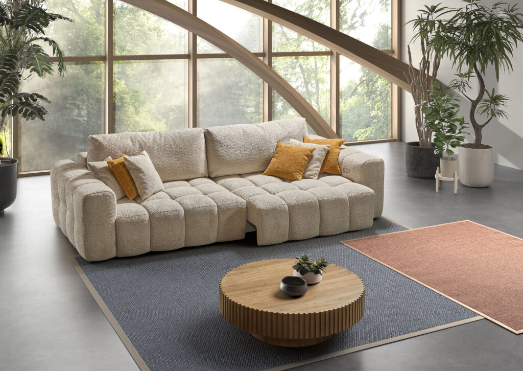 La catégorie Big Sofa compte deux modèles. Eloise invite à se relaxer et se détendre en long et en large. La profondeur d’assise de base de 90 cm est réglable électriquement jusqu’à 115 cm. Vidar est une version XXL du Chesterfield. Les deux modèles se singularisent par un habillage richement capitonné. Celui-ci n’est pas un simple effet de look, mais le fruit d’un vrai savoir-faire : le quadrillage est entièrement découpé dans la mousse. Le tissu est ensuite étiré et cousu tout autour, avec un ajout minime d’ouate. De quoi garantir un revêtement durablement net et ajusté. C’est ce qui fait toute la différence entre un capitonnage factice et techniquement maitrisé.