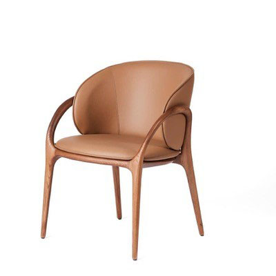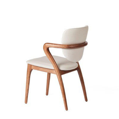 L’apothéose est incarnée par la table Lyra et les chaises Lagoon, Tempest et Vision. Des chefs-d’œuvre de confection et de savoir-faire, sculptés dans du frêne massif. Leurs formes presque « plastiques » donnent l’impression d’avoir été moulées en bois. Elles renvoient à la nature comme source des matériaux, des formes et du mouvement. Prenez le piètement de la table : un huit couché, symbole mathématique de l’infini. Les boucles en bois peuvent être interprétées comme une métaphore de l’équilibre naturel et rythmique des contraires : la succession des marées, de la nuit et du jour… Un mouvement apaisant, un sentiment rassurant. Le plateau est intégralement composé de céramique, sans autre matière sous-jacente. Les chaises affichent la même dimension artistique, en témoignent ces courts accoudoirs en prolongement des pieds.