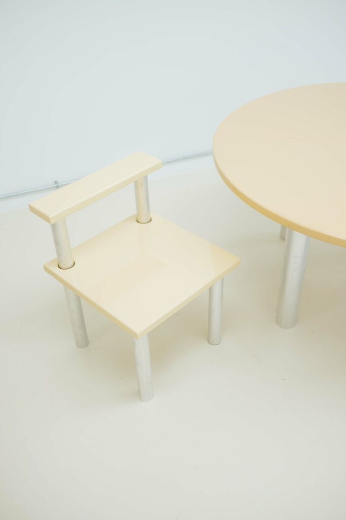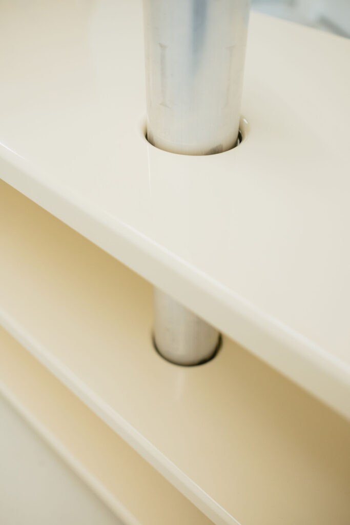 La série 808 traduit un concept philosophique, à savoir que la vie peut être très simple. Le design suit cette même logique : une table, une chaise et une étagère sous la forme la plus élémentaire. N’importe quel enfant représente ces meubles en traçant quatre pieds et une planche. Cette image est ancrée dans notre mémoire collective. « Un designer n’est pas un artisan ! Ce que je conçois, je veux aussi pouvoir le fabriquer. Donc je dois faire simple. » La série 808 est un jeu d’enfant : un tube en alu (pour les pieds) et une planche en bois (pour le plateau, l’assise et le dossier). On retrouve à nouveau cet équilibre entre les contraires de la vie, de la nature. L’aluminium mat, car non traité, à la texture rugueuse pour les montants verticaux ; le bois brillant pour les planches horizontales aux angles arrondis — fruit de huit (!) couches de laque et de polissages intermédiaires. Le résultat est une surface aussi lisse et réfléchissante qu’un métal premium imprégné. Les planches semblent flotter, sans contact avec les montants. Les tubes en alu émergent parfaitement au centre des ouvertures percées dans les planches. Un manchon et une plaquette invisibles maintiennent le tout en place. La chaise se démarque par son dossier horizontal. Situé à même hauteur que le plateau de la table, il sert de petit accoudoir ou de mini table d’appoint. La chaise vient prolonger la table ; plusieurs chaises côte à côte forment un cercle. On s’y assied de façon décontractée, plus ou moins de biais, sans chichis. Jord est un enfant de son époque.